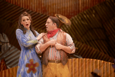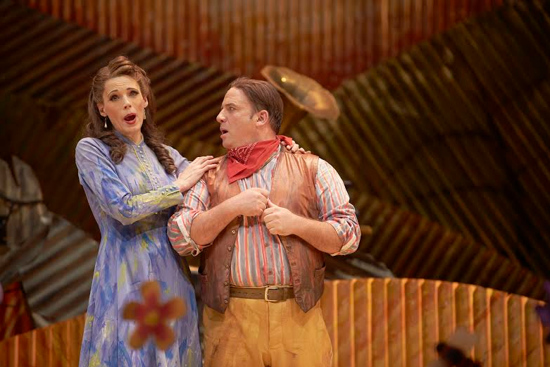 The set is built from corrugated iron dotted with sheep and when love-sick Nemorino sets eyes on Adina he declares “She’s a corker”. Previous productions of Donizetti’s 1832 opera The Elixir of Love have been set in the wild west or at the beach but now it has arrived in the outback.