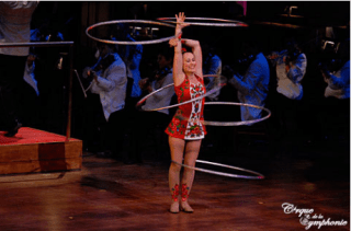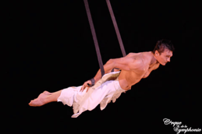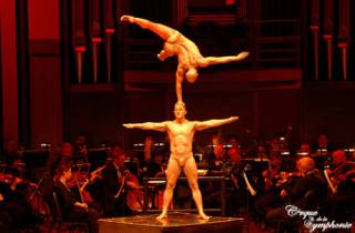 The most engaging dialogue between the music and the cirque artists occurred in the aerial acrobatics. In the aerial silks dance Christine Van Loo rose and fell according to the contour of Saint-Saens’ Danse Macabre, demonstrating impressive muscularity, flexibility and daring as she hung suspended by a foot or elbow. Vitalii Buza used aerial straps to literally fly over the audience in John Williams’ Flight to Neverland. The Valse from Tchaikovsky’s Swan Lake was bewitching as two swans (Alexander Streltsov and Chirstine Van Loo) dived, twirled and courted while suspended from red silks.