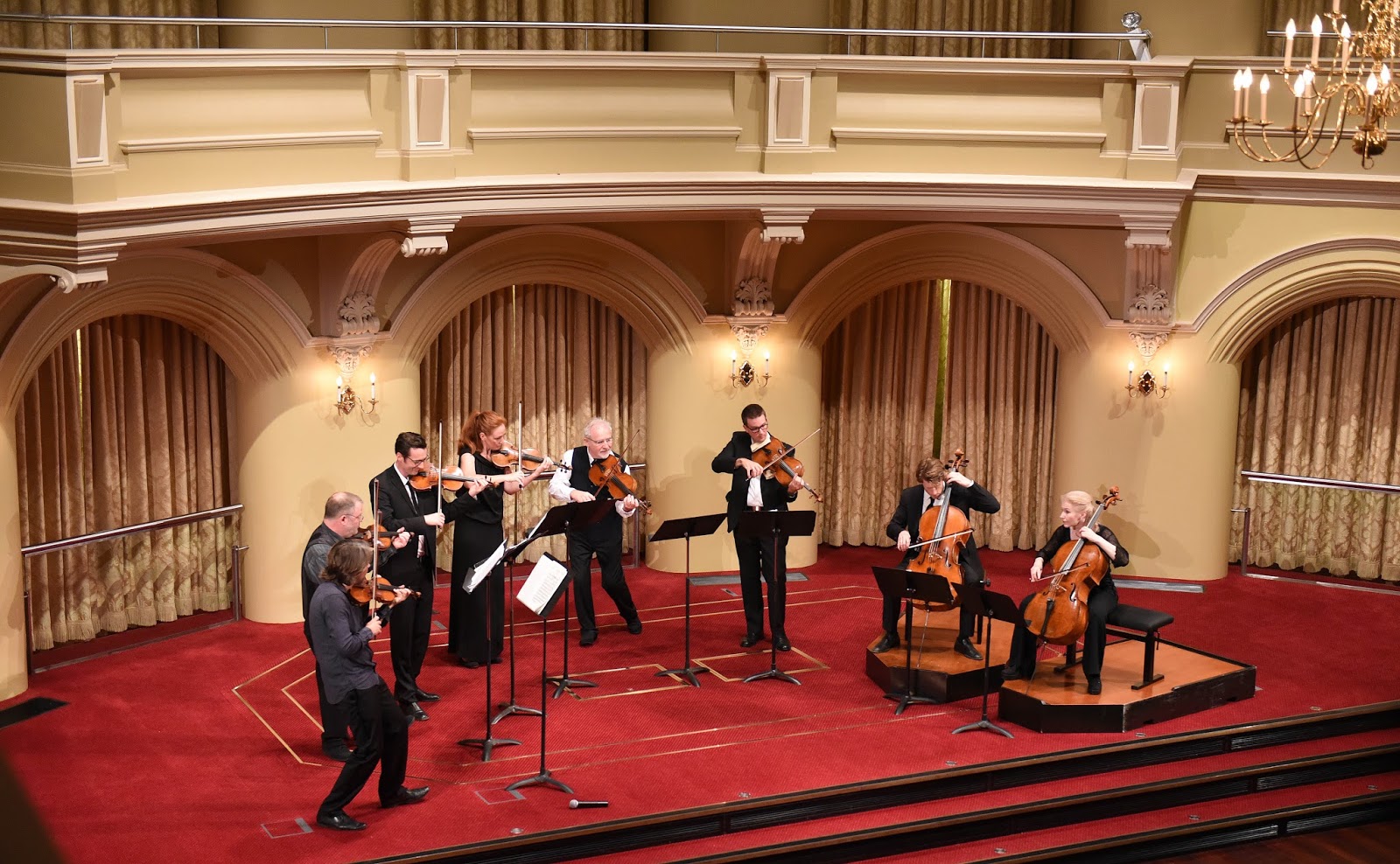 Government House Ballroom was almost full with audience members spreading to the balconies. The room’s resonant acoustic suited the octet, lending a brightness and immediacy to the string sound. In the first half of the program the four violinists shared the leadership of the ensemble which indicated a convivial partnership between the artists. But there were also pitch issues and a lack of cohesion which pointed to a lack of rehearsal.