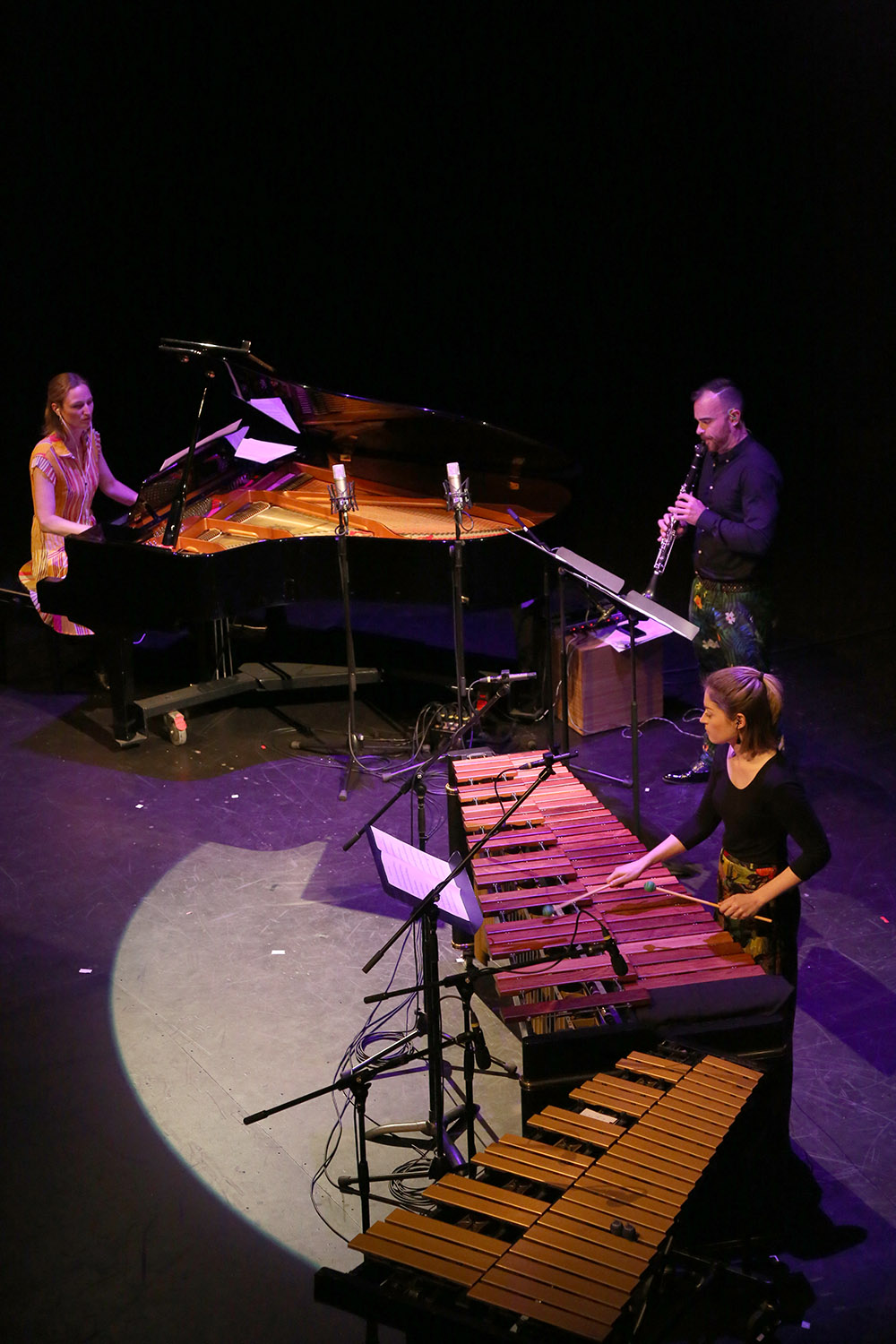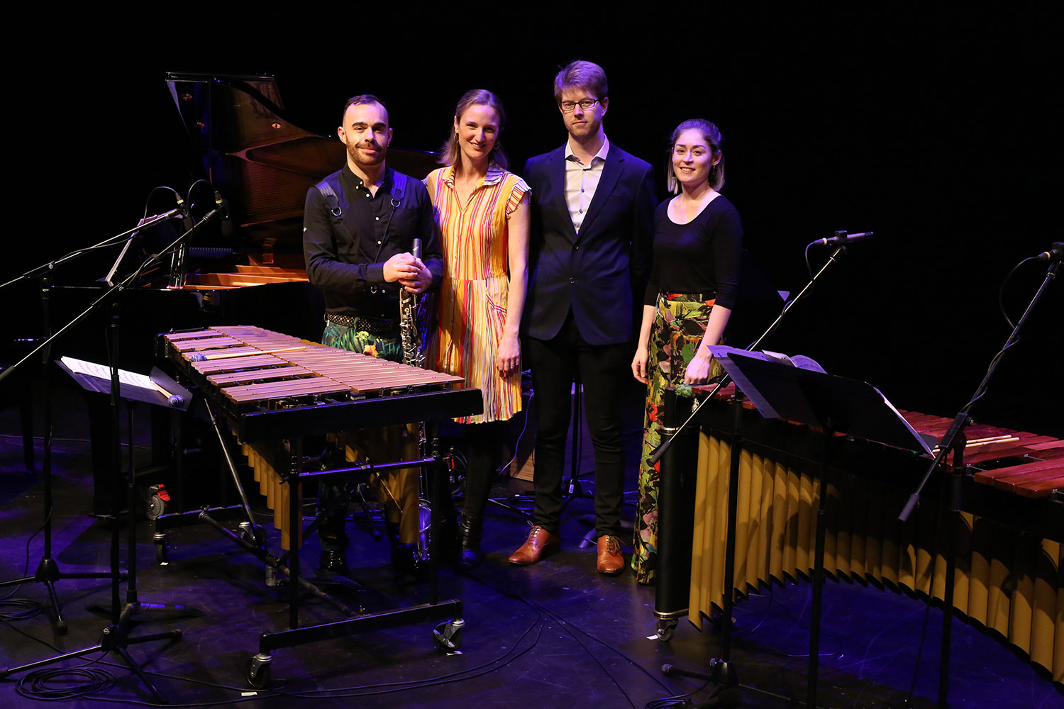 The ensemble members came together for the first time for the world premiere of Alex Turley’s Blue Heat. In a nod to American minimalism Turley’s work was built around repeated semiquaver patterns gently rising and falling in layered waves of sound. The blend of marimba, piano and clarinet created a woody warmth from which sprung soloistic sections for piano and clarinet plus an interlude of piano and marimba droplets sounding just like a music box. Blue Heat was a mix of extreme softness, transparent textures and simmering energy, released finally in a frantic race to the end.